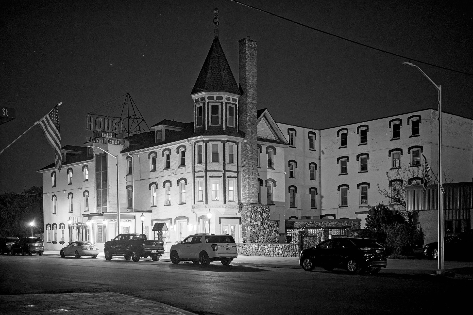 The House of Ludington standing proudly lit up a nighttime.